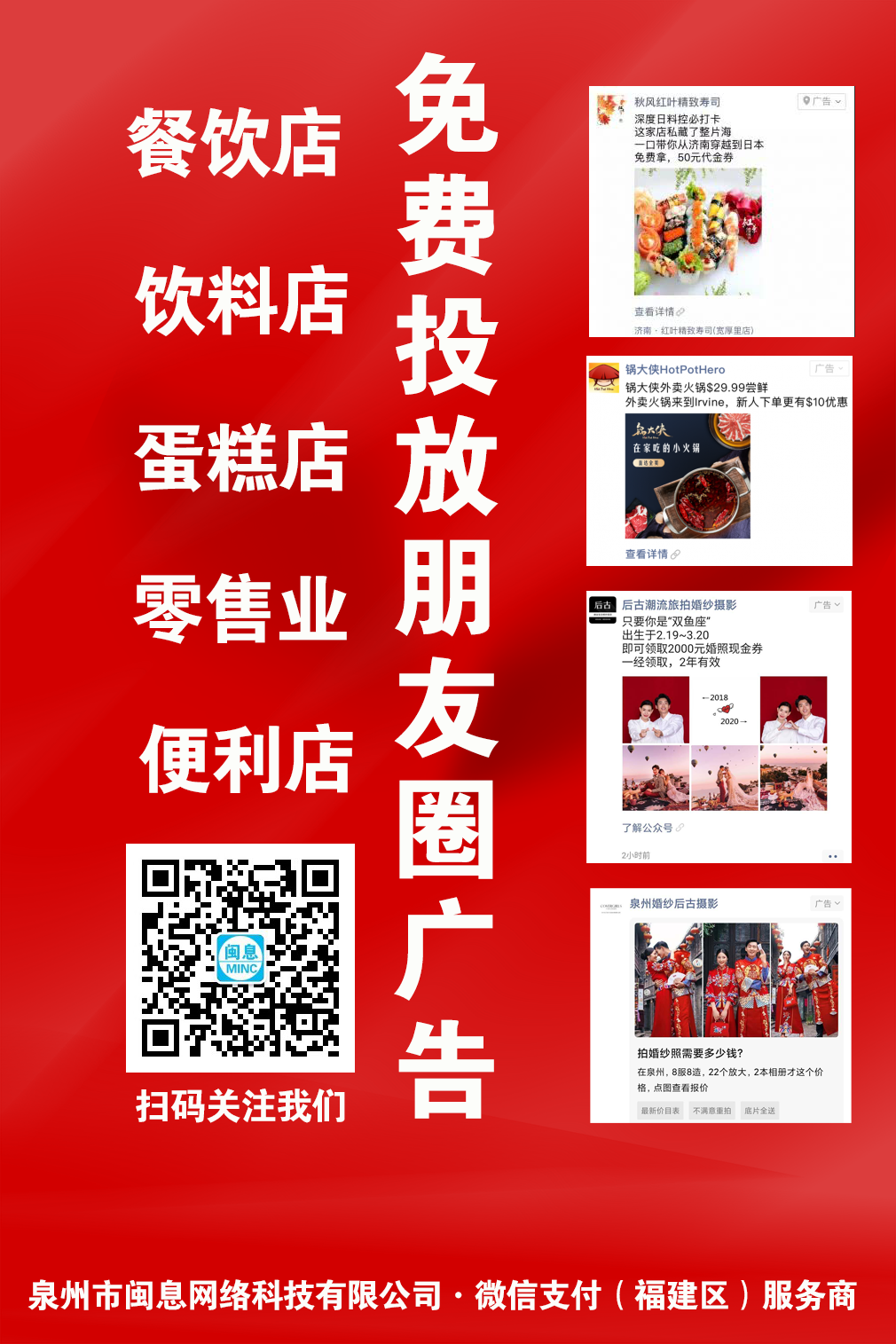 继免费帮注册活动,闽息网络科技又一大免费活动,简单粗暴【免费帮投放朋友圈广告】,你没看错只要你是餐饮店/零售店,我们就免费帮你做广告。实实在在的帮助,如果免费帮你都不要,估计你就是传说中扶不起的阿斗。